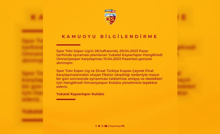 Kayserispor Kulübü’nden yapılan açıklamada; "Spor toto Süper Lig’in 28 haftasında 09.04.2023 Pazar tarihinde oynanması planlanan Yukatel Kayserispor - Hangi Kredi Ümraniyespor karşılaşması 10.04.2023 Pazartesi gününe alınmıştır. Spor toto süper Lig ve Ziraat Türkiye Kupası çeyrek final karşılaşmalarından oluşan fikstür sıkışıklığı nedeniyle maçın bir gün sonrasında oynanması talebimize anlayış ve destekleri için Hangi Kredi Ümraniyespor Kulübü yönetimine teşekkür ederiz" ifadelerine yer verildi.