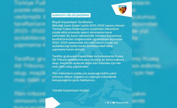 Yukatel Kayserispor kulübünden yapılan açıklamada "Büyük Kayserispor taraftarı; bilindiği üzere Süper Lig’de 2021-2022 sezonu öncesi Türkiye Futbol Federasyonu tarafından tribünlerin yüzde ellisi oranında seyirci alınmasına karar verilmiştir. Bu karar neticesinde yönetim kurulumuz taraftarlarımızın mağduriyete uğramaması açısından 2021-2022 sezonunda tüm tribünlerin yüzde yüz açılabileceği tarihe kadar kombine bilet satışı yapmama kararı almıştır. Taraftar grubumuz Kapalı Kale ile özdeşleşmiş Kuzey alt tribünü kendilerine satış önceliği ile tahsis edilmiş, olup maçlarda açılacak diğer tüm tribünler için her maç bilet satışı yapılacaktır. Tüm tribünlerin yüzde yüz açılacağı tarihin yakın olmasını diliyor, sağlıklı ve coşkuyla tribünlerde bulacağımız günü bekliyoruz" denildi.Kayserispor yeni sezonda kombine bilet satışı yapmayacak