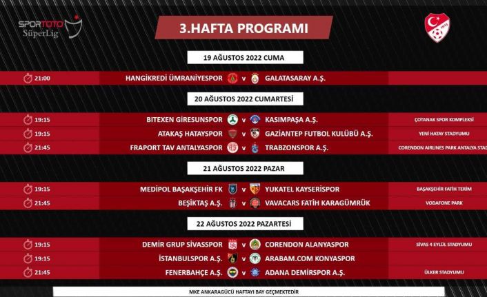 Ligin ilk 2 haftasında 3 puan toplayan Yukatel Kayserispor, bu hafta deplasmanda Başakşehir ile karşılaşacak. Fatih Terim Stadındaki maç Pazar günü oynanacak. Maçın başlama saati 19:15 olarak belirlendi. Haftanın ilk maçı Cuma günü Ümraniyespor ile Galatasaray arasında oynanacak. Cumartesi günü 3 müsabakanın oynanacağı Süper Lig 3. haftasında Pazar günü de Başakşehir-Kayserispor ve Beşiktaş-Karagümrük maçları oynanacak. Pazartesi günü oynanacak 3 maç ile de hafta nihayetlenecek.