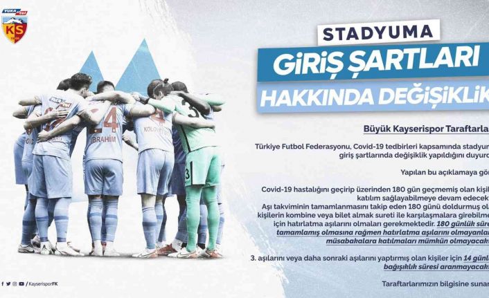 Süper Lig takımlarından Yukatel Kayserispor Kulübü, yazılı bir açıklama yaparak sarı kırmızılı taraftarı Covid19 aşısı olmaları konusunda uyardı. Kulüpten yapılan açıklamada; "Türkiye Futbol Federasyonu, Covid-19 tedbirleri kapsamında stadyuma giriş şartlarında değişiklik yapıldığını duyurdu. Yapılan bu açıklamaya göre; Covid-19 hastalığını geçirip üzerinden 180 gün geçmemiş olan kişiler katılım sağlayabilmeye devam edecektir. Aşı takviminin tamamlanmasını takip eden 180 günü doldurmuş olan kişilerin kombine veya bilet almak sureti ile karşılaşmalara girebilmesi için hatırlatma aşılarını olmaları gerekmektedir. 180 günlük süreyi tamamlamış olmasına rağmen hatırlatma aşılarını olmayanların müsabakalara katılmaları mümkün olmayacaktır. 3. aşılarını veya daha sonraki aşılarını yaptırmış olan kişiler için 14 günlük bağışıklık süresi aranmayacaktır. Taraftarlarımızın bilgisine sunarız" denildi.