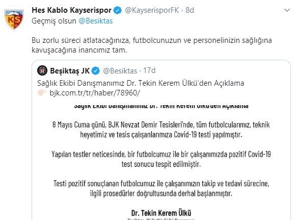 Süper Lig ekiplerinden Beşiktaş Kulübünde bir futbolcu ve bir kulüp çalışanında korona virüs (Covid-19) tespit edilmesinden ardından birçok kulüp Beşiktaş’a geçmiş olsun mesajı yayımladı. Hes Kablo Kayserispor Kulübünden yapılan açıklamada, “Geçmiş olsun Beşiktaş. Bu zorlu süreci atlatacağınıza, futbolcunuzun ve personelinizin sağlığına kavuşacağına inancımız tam” denildi.