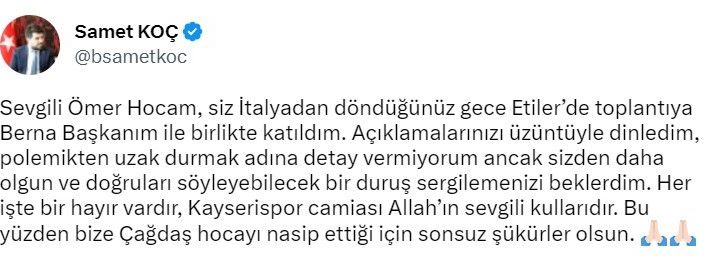 Kayserispor Basın Sözcüsü Samet Koç, Ömer Erdoğan’ın daha olgun ve doğruları söyleyebilecek bir duruş sergilemesini isterken, "Sevgili Ömer Hocam, siz İtalya’dan döndüğünüz gece Etiler’de toplantıya Berna Başkanım ile birlikte katıldım. Açıklamalarınızı üzüntüyle dinledim, polemikten uzak durmak adına detay vermiyorum ancak sizden daha olgun ve doğruları söyleyebilecek bir duruş sergilemenizi beklerdim. Her işte bir hayır vardır, Kayserispor camiası Allah’ın sevgili kullarıdır. Bu yüzden bize Çağdaş hocayı nasip ettiği için sonsuz şükürler olsun" cümleleri kurdu.