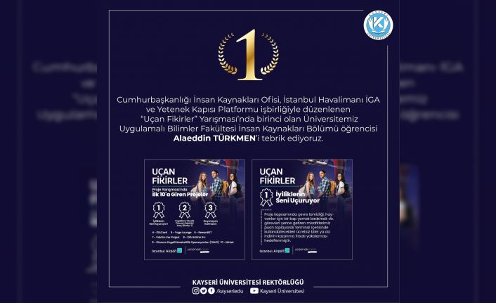 Kayseri Üniversitesi (KAYÜ) Uygulamalı Bilimler Fakültesi İnsan Kaynakları Yönetimi Bölümü 3. sınıf öğrencisi Alaeddin Türkmen, Cumhurbaşkanlığı İnsan Kaynakları Ofisi, İstanbul Havalimanı İşletmesi İGA ve Yetenek Kapısı Platformu işbirliğiyle düzenlenen Uçan Fikirler Yarışmasında “İyiliklerin Seni Uçuruyor” adlı projeleri ile takım arkadaşıyla birlikte birinci oldu.