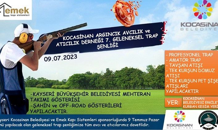 Kocasinan Argıncık Avcılık ve AtıcılıkDerneği tarafından geleneksel olarak düzenlenen Trap Şenliği’nin 7.’si 9 Temmuz Pazar günü yapılacak.
