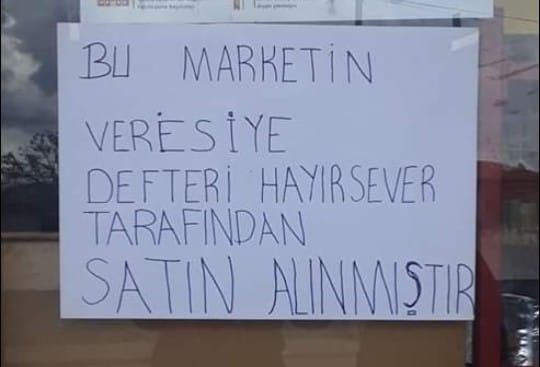 Mahalle sakinlerinden Necati Tokbay; "Kasabamızda bir ilk oldu. İsmini açıklamayacağımız değerli bir hayırseverimiz tarafından marketteki veresiye defteri bedeli ödenerek satın alınmıştır. Bu tarihe kadar olan borçlar silinmiştir. Bu mübarek günde yapılan hayrı Allah kabul etsin. Vesile olmaktan gurur duyuyorum. Böyle hayırların devamı inşallah gelir" dedi.