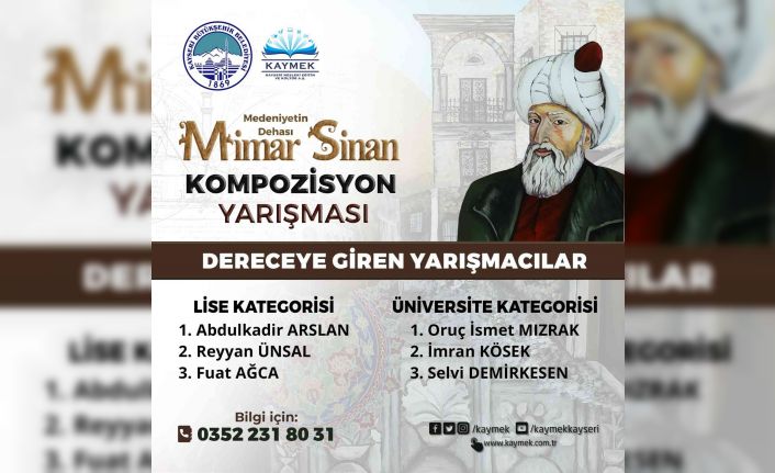 Kayseri Büyükşehir Belediyesi, bünyesinde faaliyetlerini yürüten Kayseri Mesleki Eğitim ve Kültür A.Ş. (KAYMEK) 7’den 70’e tüm vatandaşlara hitap eden mesleki ve sanat kurslarının yanı sıra eğitim, kültür ve sanata verdiği destekle adından sıkça söz ettirmeye devam ediyor. KAYMEK, sanatsal, mesleki ve kişisel gelişim kursları, öğrencilere yönelik akademik ders takviyeleri, sergiler, workshoplar ve seminerleri ile binlerce insana dokunurken, ayrıca gençlere yönelik düzenlediği ödüllü yarışmalarla millî ve manevi değerlerimizi yaşatma ve gelecek kuşaklara aktarma adına çalışmalarını sürdürüyor. Kültürel değerleri ön plana çıkaran KAYMEK, kadim kentin bir evladı olan ve medeniyetin inşasına büyük katkılar sunan Mimar Sinan anısına “Medeniyetin Dehası Mimar Sinan” Kompozisyon Yarışması düzenledi. Başvuruları 15 Şubat 2022 başlayıp 20 Mart 2022 tarihinde sona eren ödüllü kompozisyon yarışmasına ikamet adresi Kayseri olan veya kentte eğitim öğretim gören 26 yaşından küçük lise ve üniversite öğrencileri katılım sağladı. Kayseri’nin bir değeri ve medeniyetin dehası olan Mimar Sinan’ın eserleri, düşünce dünyası, insanlığa ve medeniyete bıraktığı maddi ve manevi miras gibi konularda yazılmış olan kompozisyonlar lise ve üniversite olmak üzere iki farklı kategoride değerlendirildi.
