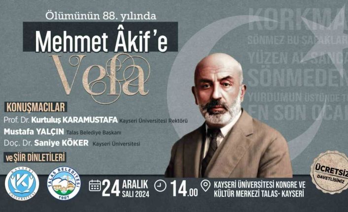 İstiklal Marşı şairi merhum Mehmet Akif Ersoy, vefatının 88. yılında Talas Belediyesi ve Kayseri Üniversitesi (KAYÜ) işbirliğiyle düzenlenecek programda anılacak.