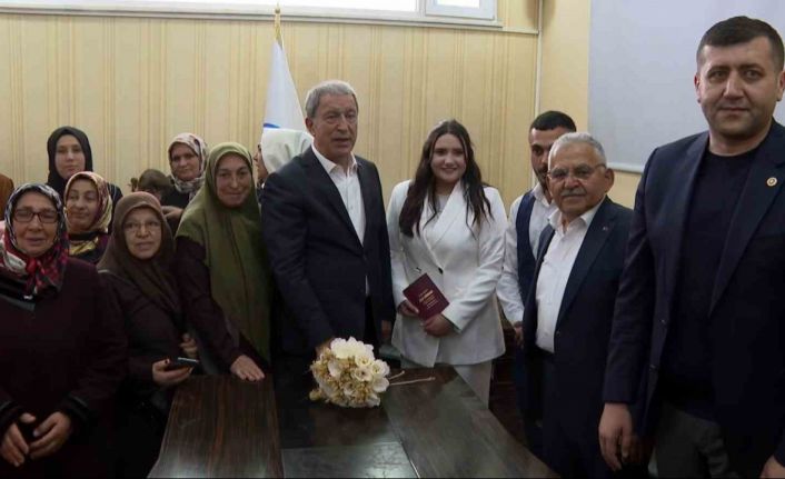 Milli Savunma Bakanı Hulusi Akar, ziyaret ettiği Tomarza Belediyesinde bir nikahın kıyıldığını görmesi üzerine salona girerek yeni çifte sürpriz yaptı. Nikahları kıyılan Sefa-Rabia Baş Bakan Akar’ı karşılarında görünce büyük heyecan yaşadı.