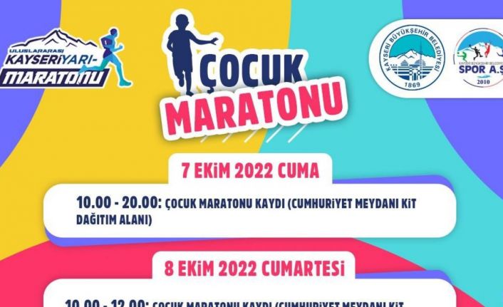 Kayseri Büyükşehir Belediye Başkanı Dr. Memduh Büyükkılıç’ın 150. Yılda 150 Projesi çerçevesinde bu yıl ikincisi ‘Erciyes’ temasıyla 9 Ekim 2022 Pazar günü gerçekleşecek ve büyük bir heyecana sahne olacak maratonda çocuklar da unutulmadı. Büyükşehir, Spor A.Ş. marifetiyle spor sevgisi aşıladığı miniklere özel ‘Maratona Minik Bir Adım’ sloganıyla çocuk maratonu düzenliyor. Uluslararası Kayseri Yarı Maratonu Kit Dağıtım Günleri’nde 7-15 yaş aralığındaki çocukların katılım sağlayabileceği Çocuk Maratonu koşulacak. Kayıtların ücretsiz olduğu Çocuk Maratonu’na katılmak isteyen minikler, 7 Ekim 2022 Cuma Cumhuriyet Meydanı kit dağıtım alanında saat 10.00 ile 20.00 arasında, 8 Ekim 2022 Cumartesi yine Cumhuriyet Meydanı kit dağıtım alanında saat 10.00 ile 12.00 arasında kayıt işlemlerini gerçekleştirebilecek. Miniklerin heyecan dolu rekabetine sahne olacak Çocuk Maratonu, 8 Ekim 2022 Cumartesi saat 14.00’te koşulacak.