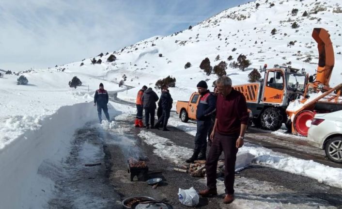 Tomarza-Tufanbeyli arasında kar temizleme çalışmalarını sürdüren personel ve jandarma ekiplerine Aslantaş Mahalle Muhtarları yemek ikram etti.