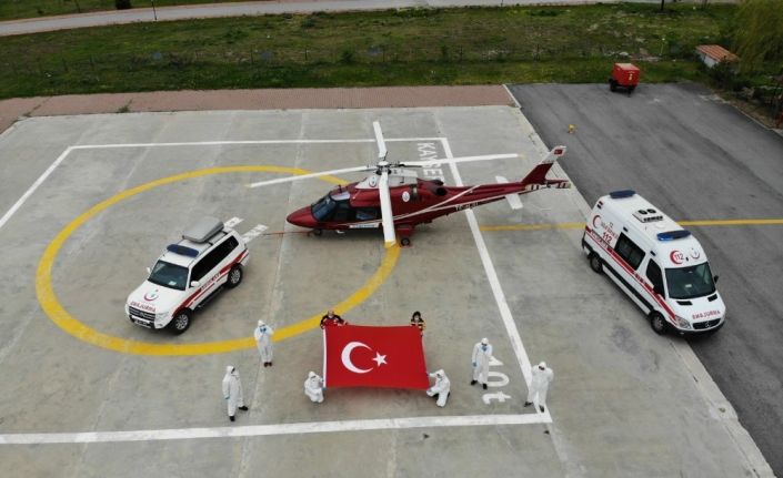 Kayseri ve çevre illerdeki önemli olaylarda en kısa sürede vakaya ulaşan Hava Ambulansı’nın pistinde İl Sağlık Müdürlüğü Sağlık Hizmetleri Başkanı Uzm. Dr. Ahmet Ceylan ile İl Ambulans Başhekimi Dr. Figen Gürbeden ile birlikte sağlık çalışanları Türk Bayrağı açarak, 23 Nisan Ulusal Egemenlik ve Çocuk Bayramı’nı kutladı.