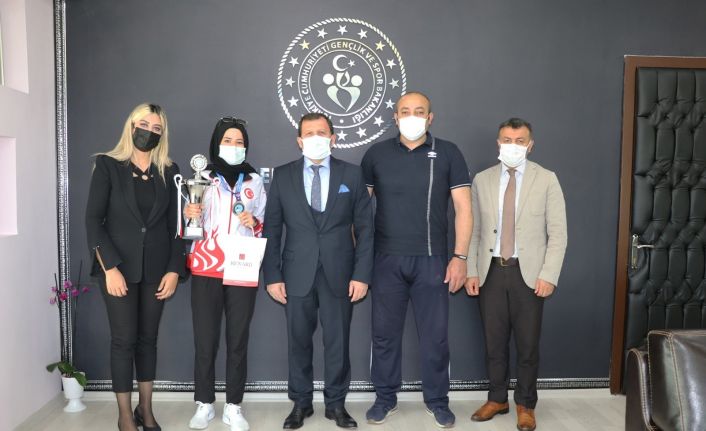 6. Uluslararası Türkiye Açık Kickboks Turnuvasında 48 kg’da şampiyon olan Kayserili Sporcu Hayriye Türksoy, Kayseri Gençlik ve Spor İl Müdürü Ali İhsan Kabakcı’yı ziyaret etti.
