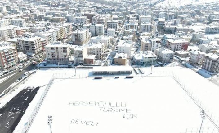İlçede etkili olan kar yağışıyla birlikte güzel görüntüler oluştu. Develi İlçe Spor Müdürlüğü personeli, karla kaplı Develi İlçe Stadı’nın zeminine herşey güçlü Türkiye için yazdı. Yazıyı görenler fotoğraf çekinirken, stat ise dron ile havadan görüntülendi.Stada ’Her şey güçlü Türkiye için’ yazdılar
