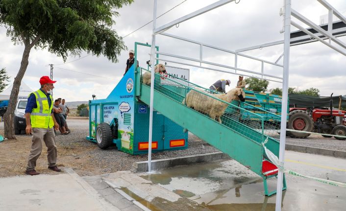 Talas Belediyesi kurduğu koyun yıkama banyoluğu ile satışa sunulan tüm koyunları ücretsiz yıkayıp dezenfekte ediyor.