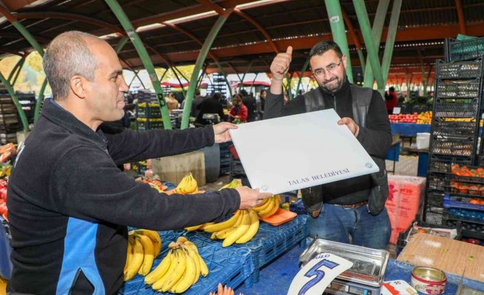 Talas Belediyesi, ölçü ve tartılarda hak kaybı yaşanmaması amacıyla ilçe genelinde kurulan pazarlardaki esnafa terazi altlığı hediye etti.