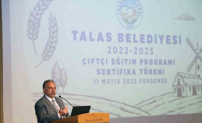 Kültür Merkezindeki programın açılışında konuşan İlçe Tarım ve Orman Müdürü Murat Ürker, tarımsal faaliyetlere katkılarından dolayı Talas Belediye Başkanı Mustafa Yalçın’a teşekkür ederek, “Çiftçilerimizin kullanıma gübre karıştırmadan koyun banyoluğuna kadar her türlü makine verdi. Biz teknik olarak eğitim sağlarken, belediyemiz de lojistik olarak destek verdi. Aşılama ve budama konusunda destekleri var. Üreticilerimizden alınan aşılama ücretlerini belediyemiz karşıladı.” dedi. Talas Belediye Başkanı Mustafa Yalçın eğitimin her işin başı olduğunu ifade ederek, “İlçe Tarım Müdürlüğümüzle çiftçilerimizin kendilerine gerekli olan her türlü bilgiyi almalarını sağladık. Tarım ve hayvancılığın önemi korona döneminde bir kez daha anlaşıldı. Çünkü gıda, insan yaşamı için önemli. Koronadan önce ekilmedik yer kalmasın diye çalışmalara başladık. Taş toplamadan gübre karıştırmaya kadar birçok makineyi çiftçimizin hizmetine sunduk. Sonra fasulye, nohut, macar fiğ gibi tohum desteğinde bulunduk. Koyun hibe ettik. Mevsimlik işçiler için ‘Tarım Anneleri Ev’neliyor projesi yaptık. Budamadan aşılamaya kadar da her türlü eğitimi verdik. Böylelikle her gün yeni bir değer daha üretmiş oluyoruz. 14 Mayıs Çiftçiler Gününüzü kutluyorum. Allah devlete zeval vermesin.” diye konuştu. Erciyes Üniversitesi Rektörü Prof. Dr. Fatih Altun, “Konuya uygun olarak araştırma üniversiteleri arasında ülkemizde ve dünyada tarım arzı güvenliğiyle ilgili çok geniş bir proje aldık. Bu proje 108 milyon fona sahip. Burada tarımsal faaliyetleri geliştirmek amaçlanıyor. Bu projenin Erciyes Üniversitesi öncülüğünde yapılacak olmasının bu sertifika töreniyle çok uyumlu olduğunu düşünüyorum. Çünkü sizlere ihtiyacımız olacak. Bu vesileyle Talas Belediye Başkanımıza teşekkür ediyorum.” şeklinde konuştu.