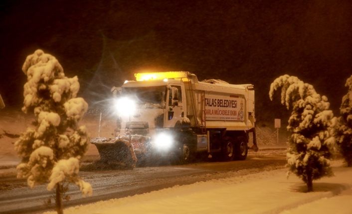 Talas Belediyesi karla mücadele ekipleri etkisini artıran kar yağışıyla birlikte özellikle gece mesaisini ara vermeden sürdürüyor.