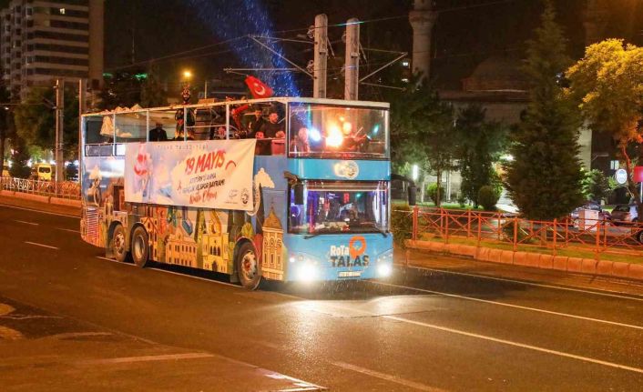 Talas Belediyesi’nin pandemiyle birlikte geleneksel hale getirdiği üstü açık gezi otobüsüyle kutlama etkinliği, 19 Mayıs Atatürk’ü Anma Gençlik ve Spor Bayramı’nda da devam etti.