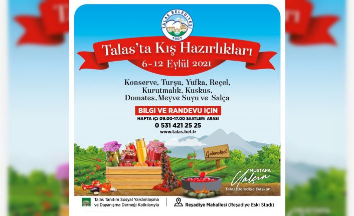 Talas Belediyesi tarafından ’Talas’ta Kış Hazırlıkları’ adı altında düzenlenen kışlık yiyeceklerin hazırlanmasını içeren organizasyon, bu yıl 06-12 Eylül tarihleri arasında gerçekleştirilecek.