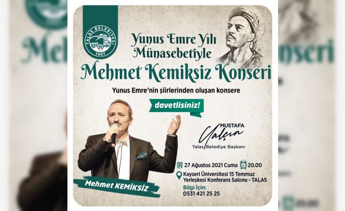 TRT Sanatçısı Mehmet Kemiksiz’in Yunus Emre’nin şiirlerinden oluşan eserleri seslendireceği konser 27 Ağustos Cuma günü saat 20.00’de başlayacak. Kayseri Üniversitesi 15 Temmuz Yerleşkesi Konferans Salonu’ndaki konserle ilgili 0531 421 25 25 numaralı telefondan bilgi alınabilecek.