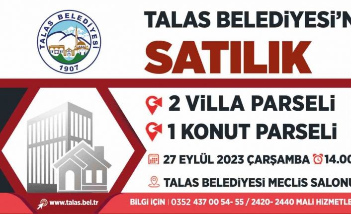 Mülkiyeti Talas Belediyesi’ne ait 2 villa parseli ve 1 konut parselinden oluşan taşınmazlar, düzenlenecek ihale ile satışa sunulacak. Satışlardan elde edilecek gelir, Talas Belediyesi’nin yeni yatırım ve hizmetlerinde kullanılacak.