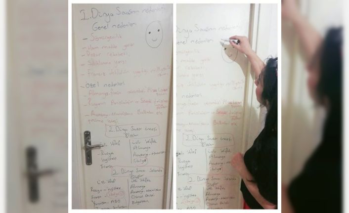 Kayseri’de uzaktan eğitim çerçevesinde mutfak dolabının üzerinde yazdığı örneklerle öğrencilerine ders anlatan öğretmenden sonra Kayseri Güneşli Ortaokulu’ndan Gülistan öğretmen de farklı bir yol ile öğrencilerine ders anlattı. Gülistan öğretmen evinin kapılarını ders tahtası olarak kullanarak görüntülü olarak bağlanan öğrencilerine inkılap dersi anlattı.