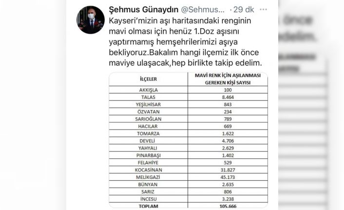 Vali Günaydın; paylaşımında; "Kayseri’mizin aşı haritasındaki renginin mavi olması için henüz 1. doz aşısını yaptırmamış hemşehrilerimizi aşıya bekliyoruz. Bakalım hangi ilçemiz ilk önce maviye ulaşacak, hep birlikte takip edelim" dedi. Günaydın ayrıca ilçelerin mavi renge dönmesi için aşılanması gereken kişi sayısını da paylaştı. Buna göre Kayseri’de toplam 105 666 kişinin aşı olması gerekiyor.Vali Günaydın’dan aşı çağrısı