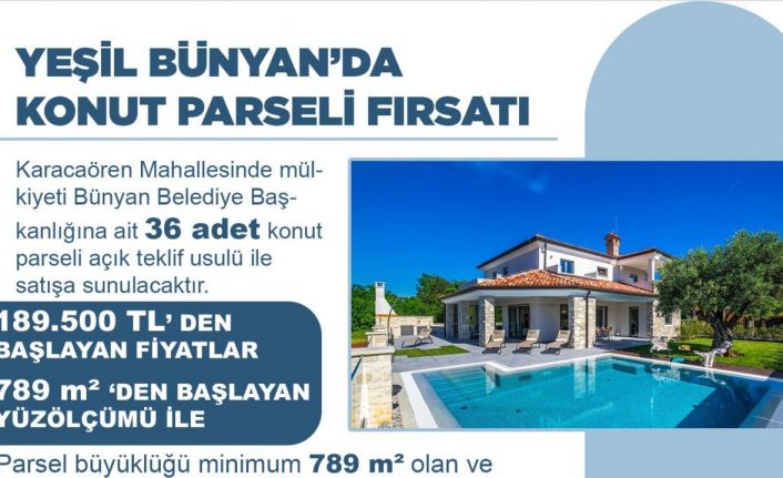 İlçeye bağlı Karacaören Mahallesi’nde mülkiyeti Bünyan Belediye Başkanlığı’na ait 36 adet 789 metrekareden başlayan konut parseli, 189 bin 500 TL’den başlayan fiyatlarla 31 Mayıs Çarşamba günü saat 10:30’da Bünyan Belediyesi Hizmet Binasında açık teklif usulü ile satışa sunulacak.