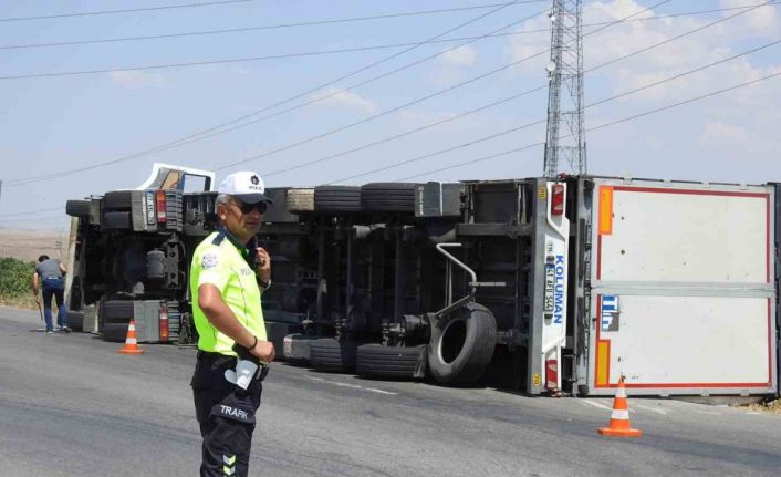 Kilis’te virajı alamayan kumaş yüklü tır devrildi. Yaralanan sürücü ve yanındaki yolcu hastaneye kaldırıldı.