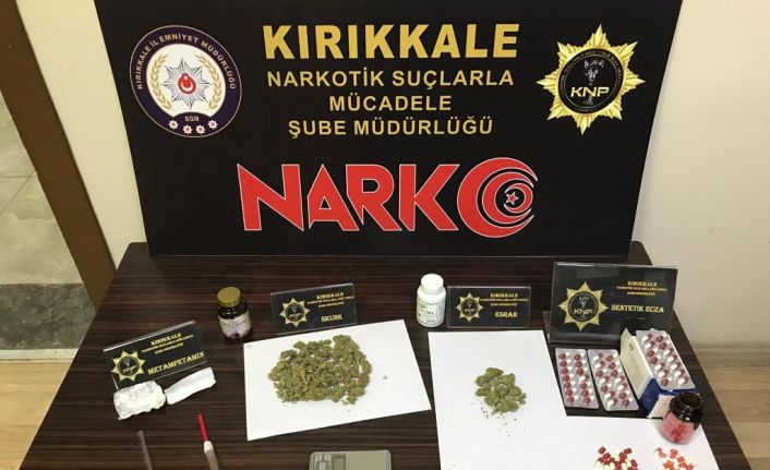 Kırıkkale Cumhuriyet Başsavcılığı koordinesinde İl Emniyet Müdürlüğü Narkotik Suçlarla Mücadele Şubesi ekiplerince, uyuşturucu madde ticareti ve kullanan şahısların yakalanmasına yönelik çalışmalar sürüyor. Edinilen bilgiye göre, Ankara kara yolu üzerindeki trafik kontrol noktasında narkotik denetimi yapan polis ekipleri, şüpheli görülen bir araçta arama yaptı. Aramada, 40,42 gram skunk, 11,64 gram esrar, 1,8 gram metamfetamin ve 75 adet sentetik ecza hapı ele geçirildi. Uyuşturucu ile yakalanan F.K., polis ekiplerince gözaltına alındı. Emniyetteki işlemlerin ardından adliyeye sevk edilen şahıs, tutuklandı.
