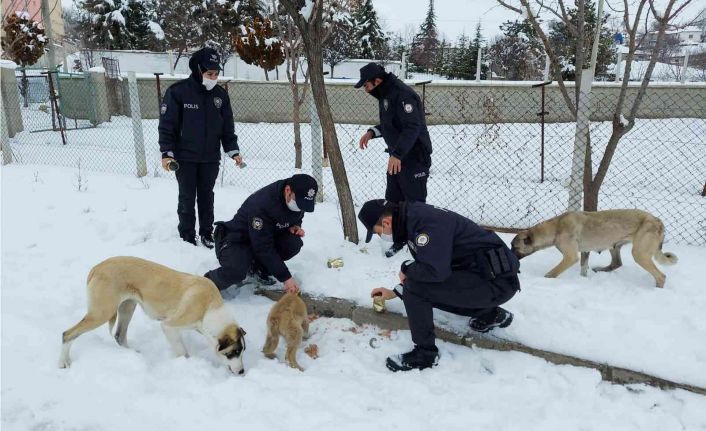 Kırıkkale’nin Sulakyurt ilçesinde polis ekipleri, kar sebebiyle yiyecek bulamayansokak hayvanlarını mama ile besledi.