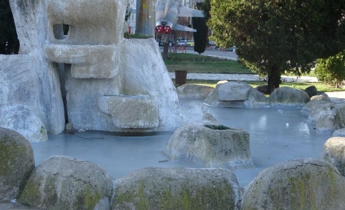 Kırklareli’nde hafta sonu etkili olan kar yağışının ardından şehirde bulunan süs havuzları dondu.