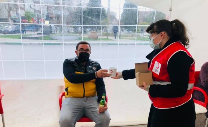 Türk Kızılay tarafından kurulan çadırda kan veren vatandaşlara Kırklareli Şube Başkanlığı bardak hediye etti.