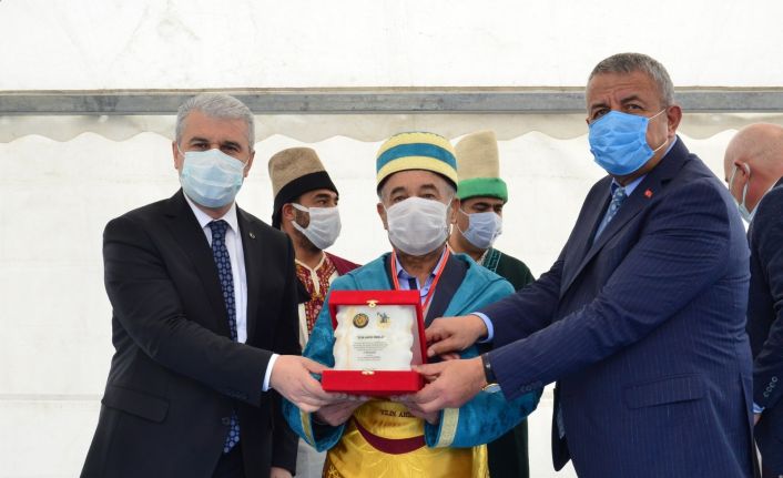 Vali İbrahim Akın, 34. Ahilik Haftası kutlamaları kapsamında ’İlin Ahisi’ seçilen ve terzilik mesleğini icra eden Mehmet Akdemir’e şed kuşatarak ödülünü verdi.