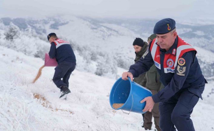 KIRŞEHİR (İHA) – Kırşehir İl Jandarma Komutanlığı Çevre, Doğa ve Hayvanları Koruma Timi; Kırşehir Doğa Koruma ve Milli Parklar Müdürlüğü ekipleri ile birlikte Kervansaray Genel Avlağı’nda yaşayan yaban hayvanları için yem bıraktı.