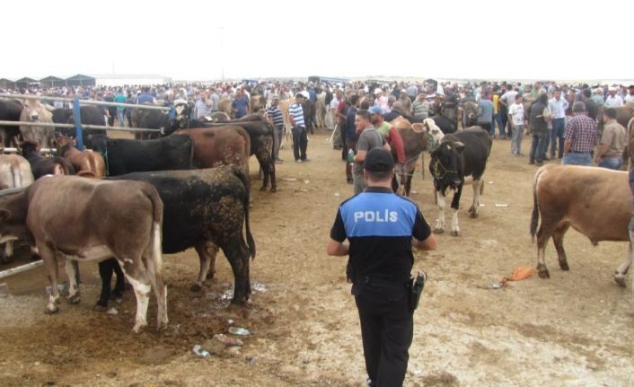 Önleyici polislik faaliyetleri kapsamında yapılan çalışmalarda kurban alımlarının yoğun yapıldığı canlı hayvan pazarında bilgilendirme faaliyetleri alıcı ve satıcılara yönelik yapılıyor.