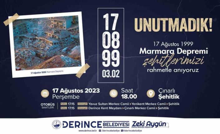Üzerinden 24 yıl geçen Gölcük Depremi unutulmuyor. Büyük depremin 24. yıl dönümünde Derince Belediyesi şehitleri anmak için program düzenliyor. 17 Ağustos Perşembe günü Çınarlı Deprem Şehitliği’nde düzenlenecek programa katılmak isteyen vatandaşlar için saat 17:15’te Derince Kent Meydanı ve Yavuz Sultan Merkez Camii önünden araçlar hareket edecek. Kent Meydanı’ndan hareket edecek olan araç ardından Çınarlı Merkez Camii’nden vatandaşları alarak Deprem Şehitliğine gidecek. Yine saat 17:15’te Yavuz Sultan Merkez Camii’nden hareket edecek olan araç sonrasında Yenikent Merkez Camii önünden vatandaşları alarak Şehitliğe gidecek. Çınarlı Deprem Şehitliği’nde saat 18.00’de başlayacak olan programda Kur’an-ı Kerim Tilaveti okunarak deprem şehitleri için dualar edilecek.