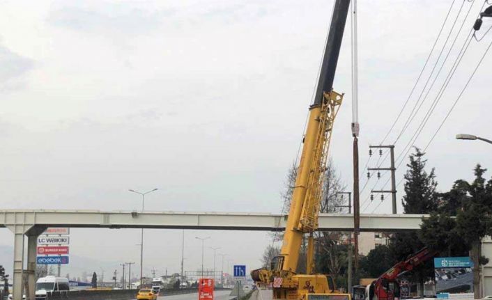 Kocaeli’nin Derince ilçesinde Çenesuyu’nda bulunan eski üstgeçit yerine yapılan asansörlü yaya üstgeçidinin kuzey kısmında köprü montajı yapıldı.