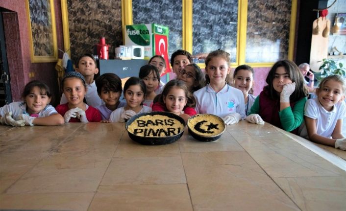 Öğrenciler Türkiye’nin güney sınırında oluşturulmaya çalışılan terör koridorunu yok etmek, bölgeye barış ve huzur getirmek amacıyla başlatılan Barış Pınarı Harekatında görev yapan Mehmetçikleri de unutmadı. Yaptıkları ekmeklerin üzerine Barış Pınarı Harekâtı yazan minikler, bazı ekmeklere de al yıldızlı bayrağı çizdi. Minik öğrenciler “Mehmetçik abilerimize selam olsun” diyerek sınırda çatışan Mehmetçiğe destek verdi.
