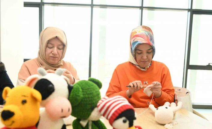 Çayırova Belediyesi’nin örgü kursuna katılan kursiyerler depremzede çocuklar için atkı, bere, patik ve oyuncak örüyor.