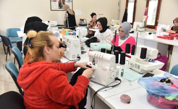 Kartepe’de meslek edindirme kurslarında eğitim alan kadınlar, depremzedelerin üşümemesi için kıyafet dikiyor.