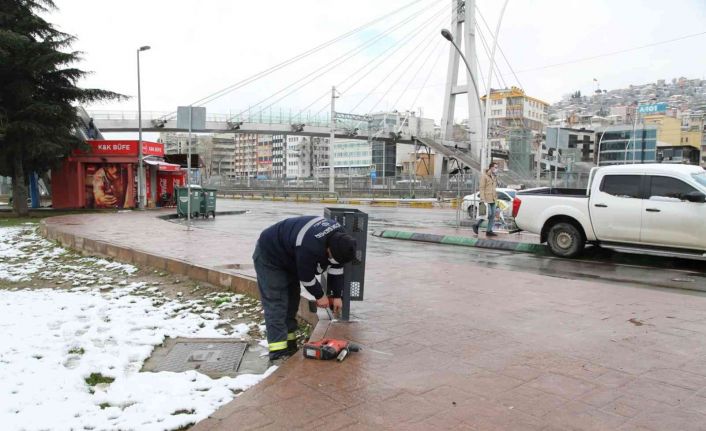 Kocaeli Büyükşehir Belediyesi Park, Bahçe ve Yeşil Alanlar Daire Başkanlığı tarafından, İzmit’te yeni çöp kovalarının montajı yapılıyor.