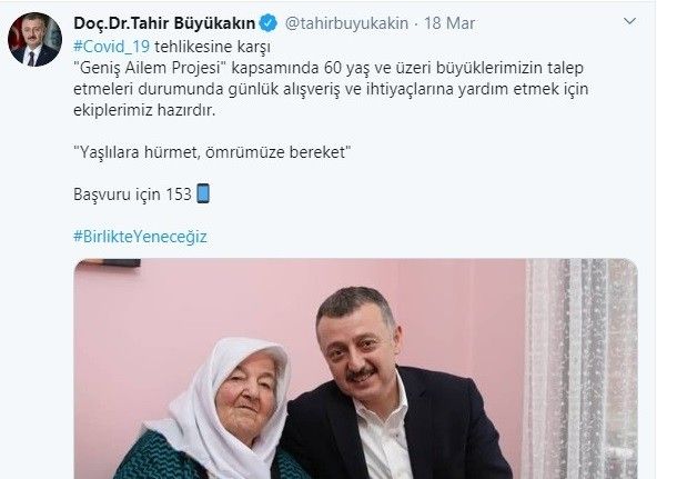 Başkan Büyükakın, Geniş Ailem projesi kapsamında 60 yaş ve üzeri büyüklerin talep etmeleri durumunda günlük alışveriş ve ihtiyaçlarına yardım etmek için ekiplerin hazır olduğunu belirtti.