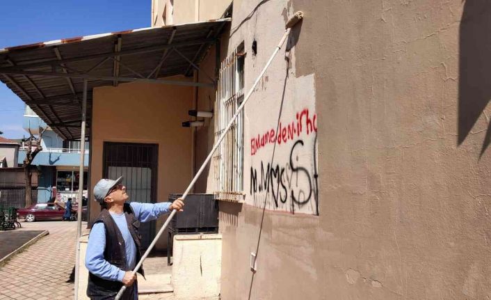 Körfez’de kamuya açık alanlarda görüntü kirliliği oluşturan duvar yazıları ve çizimler, belediye ekiplerince temizleniyor.