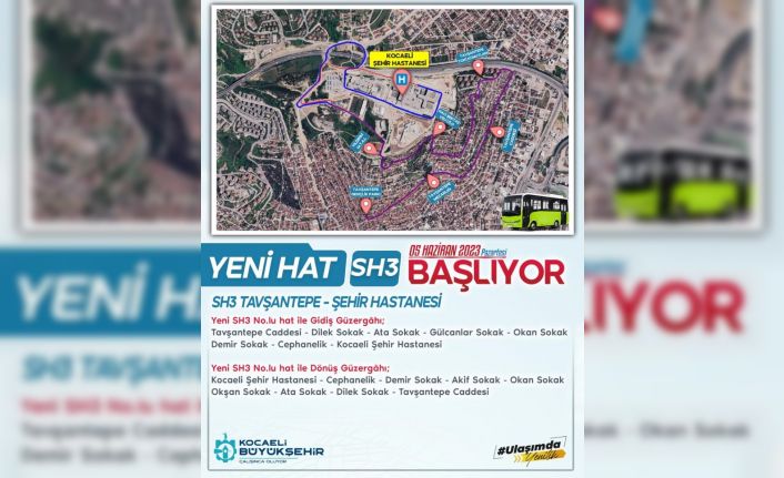 Kocaeli Büyükşehir Belediyesi Nisan ayının ilk haftasında hasta kabulüne başlayan Kocaeli Şehir Hastanesi için ulaşım planlarını düzenlemeye devam ediyor. Ulaşım dairesi başkanlığı daha önce Kocaeli Şehir Hastanesi için 8 yeni hat kurmuştu. Vatandaşların rahat ve hızlı ulaşımı için SH3 hattı da pazartesi günü seferlerine başlayacak. SH3 gidiş güzergahı; Tavşantepe Caddesi, Dilek Sokak, Ata Sokak, Gülcanlar Sokak, Okan Sokak, Demir Sokak, Cephanelik, Kocaeli Şehir Hastanesi. SH3 dönüş güzergahı;