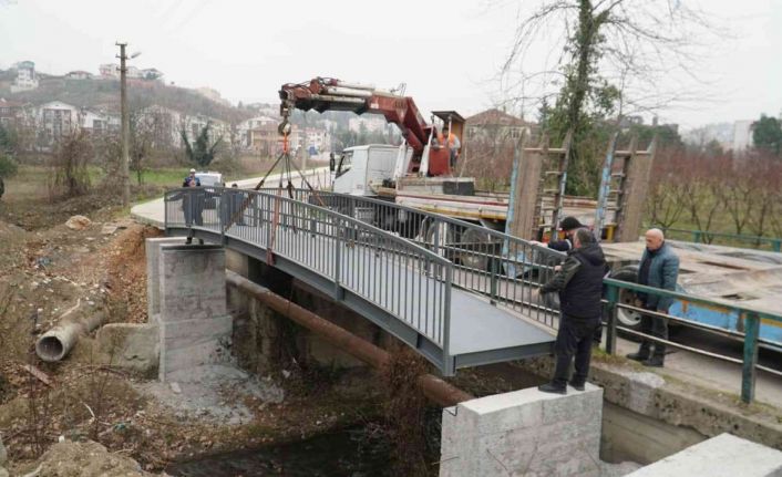 Gölcük ilçesinde Şirinköy 676. Sokak’ta yayaların güvenli ulaşımını sağlamak amacıyla yapılan yaya köprüsünün montajına başlandı.