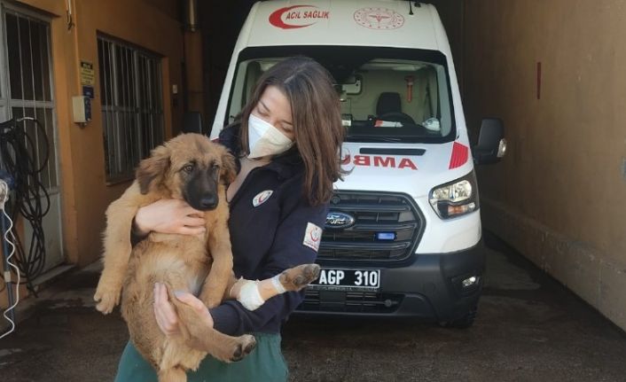 Yaralı yavru köpeğe ilk müdahale sağlık personelinden