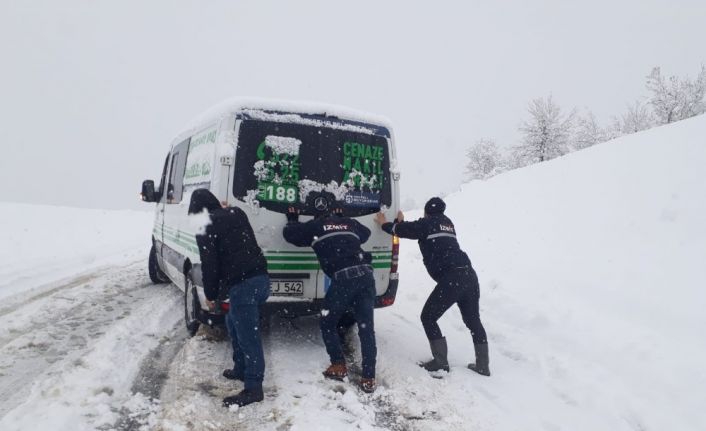 Kar küreme ve tuzlama çalışmalarını devam ettiren İzmit Belediyesi ekipleri, yolda kalan cenaze nakil aracını kurtardı.