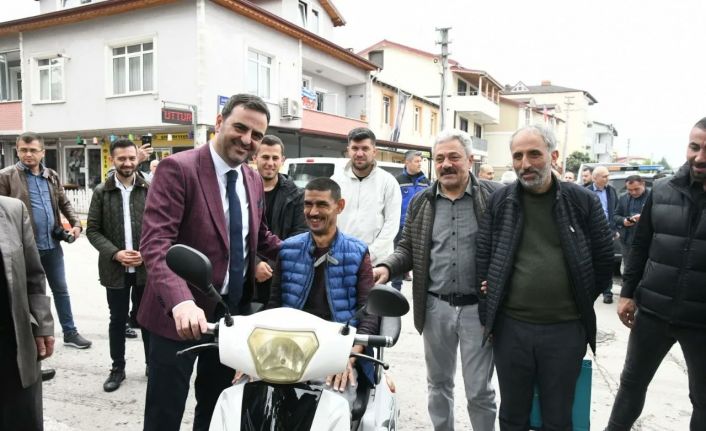 Başiskele’de bisikletiyle vatandaşların yükünü taşıyarak geçimini sağlayan Halil Baş’a, Başiskele Belediye Başkanı Yasin Özlü tarafından motosiklet hediye edildi.