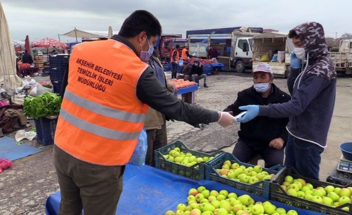Konya’nın Akşehir İlçe Belediyesi, yeni Korona virüse (COVID-19) karşı ilçe genelinde başlattığı tedbir ve önleyici eylem çalışmaları kapsamında pazar yerinde maske dağıttı.